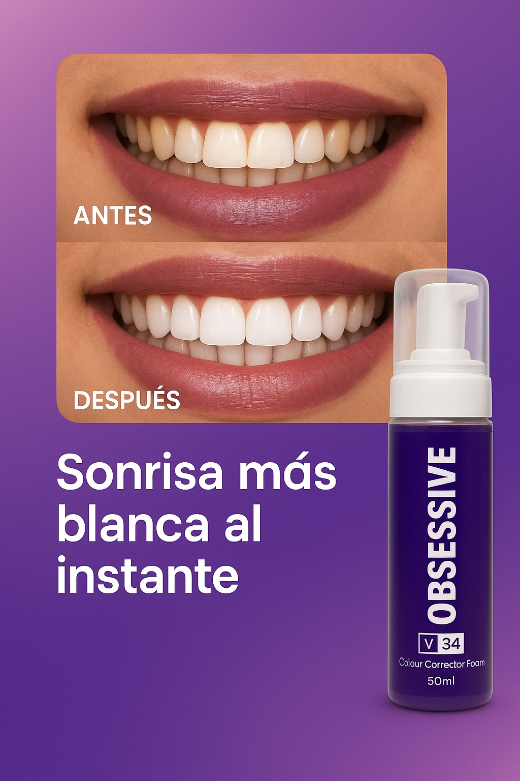 La pasta dental Obsessive V34 Purple neutraliza los tonos amarillos al instante gracias a su espuma morada correctora